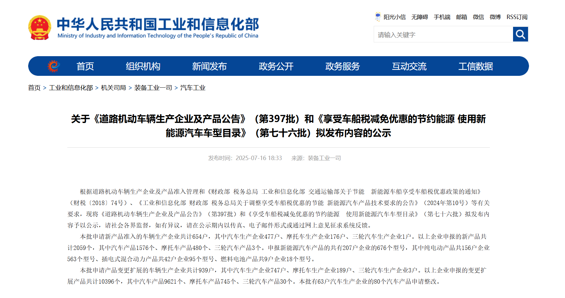 2025年,工業(yè)和信息化部第397批《道路機(jī)動車輛生產(chǎn)企業(yè)及產(chǎn)品公告》(下稱《公告》),在官方網(wǎng)站正式公示。本批申請新產(chǎn)品準(zhǔn)入的車輛生產(chǎn)企業(yè)共計654戶,其中汽車生產(chǎn)企業(yè)477戶、摩托車生產(chǎn)企業(yè)176戶、三輪汽車生產(chǎn)企業(yè)1戶。以上企業(yè)申報的新產(chǎn)品共計2059個,其中汽車產(chǎn)品1576個、摩托車產(chǎn)品480個、三輪汽車產(chǎn)品3個。申報新能源汽車產(chǎn)品的共有207戶企業(yè)的676個型號,其中純電動產(chǎn)品共156戶企業(yè)563個型號、插電式混合動力產(chǎn)品共42戶企業(yè)95個型號、燃料電池產(chǎn)品共9戶企業(yè)18個型號。