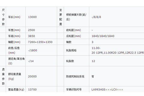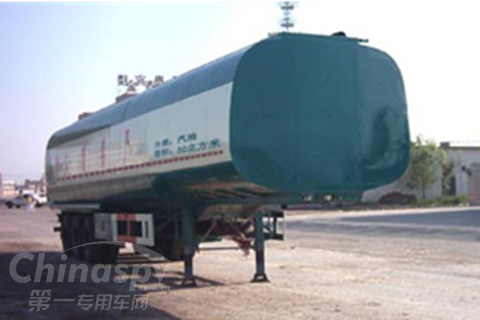 罐體外型尺寸(長×寬×高)(mm):12500×2200×1700;有效容積:30立方米;運輸介質(zhì)為汽油,密度為700公斤/立方米。ABS生產(chǎn)廠家為廣州市科密汽車制動技術(shù)開發(fā)有限公司,ABS型號為CM2XL-ZV。防護裝置所用材料材質(zhì)為Q235,側(cè)防護連接方式為螺柱螺栓,后部防護連接方式為焊接,后部防護裝置的斷面尺寸為140mm×60mm,離地高度為530mm。車載加油機型號為JSK-45B1121C,生產(chǎn)企業(yè)為穩(wěn)恩佳力佳(北京)石油化工設(shè)備有限公司。