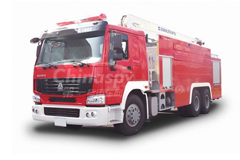 該車(chē)帶有水罐、消防泵,臂架頂端的消防炮射程遠(yuǎn),流量大,即可打直流,又可噴霧,可以在距火源較遠(yuǎn)的位置獨(dú)立完成救火作業(yè),是當(dāng)今世界上較理想的高空消防滅火裝備。