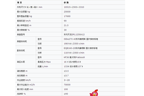 底盤:東風(fēng)天龍DFL1250A12型25噸二類汽車底盤,是目前國產(chǎn)最先進(jìn)、質(zhì)量最可靠的國4商用車底盤。采用了東風(fēng)康明斯ISDe270 40柴油發(fā)動機(jī),功率198kw,額定轉(zhuǎn)速2500r/min,排放按國4標(biāo)準(zhǔn)。
