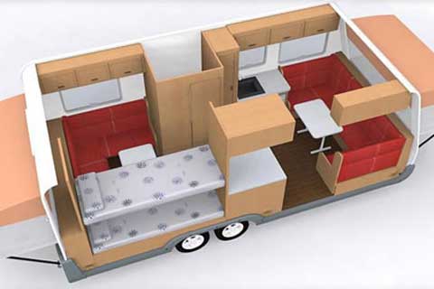 一款利用率極高的小型拖掛式房車。采用進(jìn)口拖掛式房車專用底盤,配電制動及應(yīng)急制動,確保行駛安全性。整體美式簡潔風(fēng)格,結(jié)構(gòu)精巧,安全輕便。內(nèi)部空間靈活多變,可容納多達(dá)8-10人居住。前后外伸式雙人床配紗帳及防雨帳篷非常適合春夏之季棲息在大自然中、零距離感受自然界之美輪美奐。