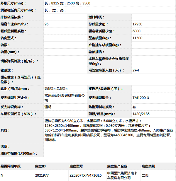 長春基洋消防飛雁牌CX5180GXFPM60/H泡沫消防車
