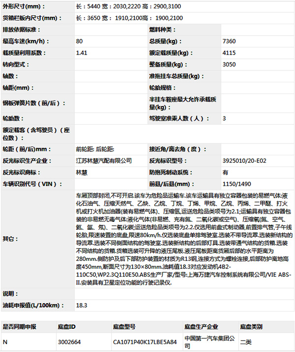 一汽解放牌CA5071XRQP40K17LE5A84易燃氣體廂式運輸車