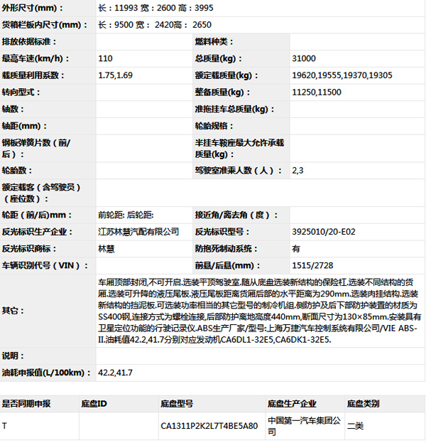 公告型號(hào) CA5311XLCP2K2L7T4E5A80