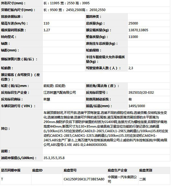 公告型號(hào) CA5250XYKP26K1L7T3E5A80