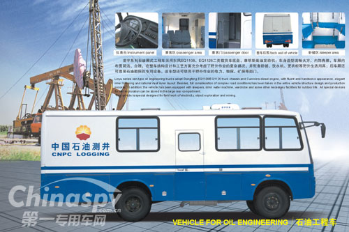 凌宇系列石油廂式工程車采用東風(fēng)EQ1108、EQ1126二類載貨車底盤,康明斯柴油發(fā)動(dòng)機(jī);車身造型流暢大方,內(nèi)飾典雅,車廂內(nèi)布置簡潔、合理,在整車結(jié)構(gòu)設(shè)計(jì)和工藝方面充分考慮了野外作業(yè)的復(fù)雜路況,并配備臥鋪、飲水機(jī)、更衣柜等野外生活用具;后車廂還可攜帶石油勘探的專用設(shè)備。該車型還使用于野外作業(yè)的電力、物探、礦探等用途。