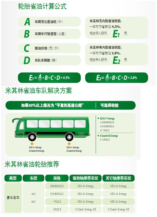 作為中國(guó)市場(chǎng)首發(fā)的驅(qū)動(dòng)軸專(zhuān)用省油輪胎產(chǎn)品,米其林XDA 2 Energy和XDA 2+ Energy,進(jìn)一步豐富了米其林省油輪胎產(chǎn)品線。自2006年面向中國(guó)卡客車(chē)輪胎市場(chǎng)率先推出第一條采用米其林Energy省油技術(shù)的輪胎米其林XZA 2+ Energy以來(lái),米其林向中國(guó)市場(chǎng)提供的多種不同規(guī)格、花紋的卡客車(chē)省油輪胎,共計(jì)為廣大米其林車(chē)隊(duì)用戶(hù)節(jié)省了超過(guò)一億升燃油,碳減排近24萬(wàn)噸,相當(dāng)于種植了728萬(wàn)棵成年樹(shù)木。作為卡客車(chē)省油輪胎市場(chǎng)的開(kāi)拓者和引領(lǐng)者,米其林不斷豐富自己的省油輪胎產(chǎn)品線,目前能夠提供8個(gè)規(guī)格、6種花紋的卡客車(chē)省油有內(nèi)胎和無(wú)內(nèi)胎輪胎產(chǎn)品,滿(mǎn)足包括中長(zhǎng)途高速客運(yùn)、貨運(yùn)以及城市公交運(yùn)輸在內(nèi)的不同行業(yè)對(duì)省油輪胎的需求,不僅為用戶(hù)帶來(lái)可觀的經(jīng)濟(jì)效益,更為社會(huì)創(chuàng)造了巨大的環(huán)保效益。